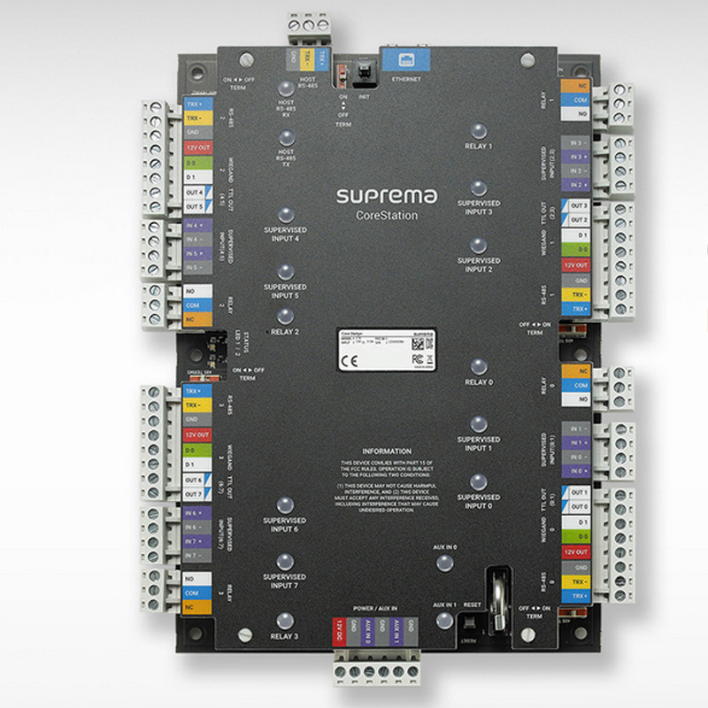 Suprema CoreStation is an intelligent door controller which provides the advantages of a biometric-enabled security over a centralized access control systems. Designed up to enterprise-level systems, the CoreStation handles up to 500,000 users with an incredible fingerprint matching speed of up to 400,000 match/sec. With the provisions of high-performance, biometric readiness, Ethernet communication, CoreStation is capable of offering the full features of the BioStar2 platform.